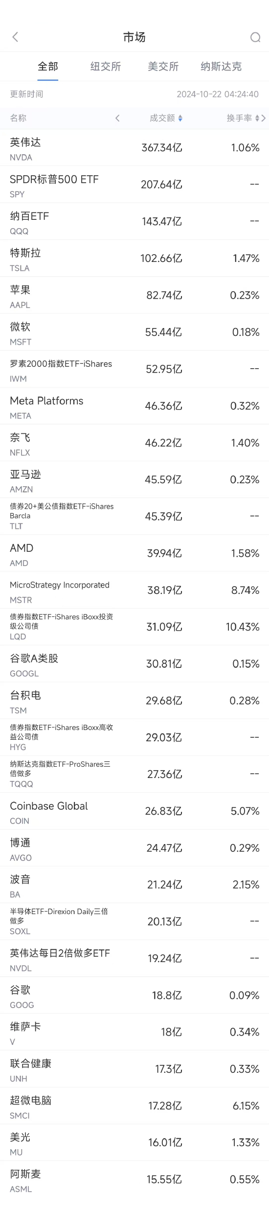 10月21日美股成交额前20:英伟达创历史新高,市值突破3.5万亿美元