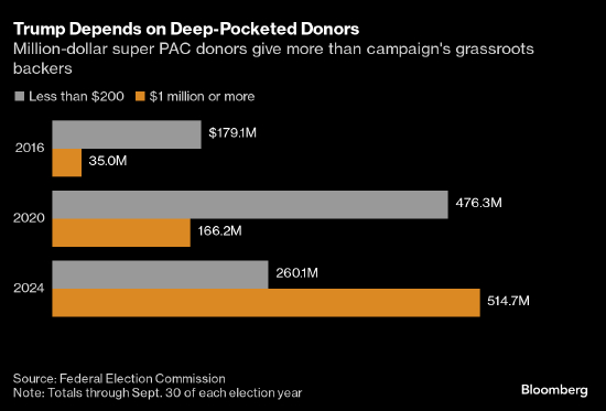 根据最新的联邦选举委员会(FEC)申报文件,今年前三季度,向超级政治行动委员会捐了至少100万美元的捐款人,给这位前美国总统的竞选活动提供了5.147亿美元的助选资金,金额几乎是其从捐款至多200美元的小额捐款人那里筹得资金 —— 2.6亿美元 —— 的两倍。