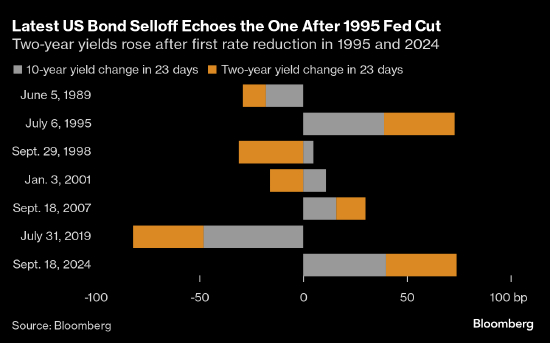 2年期收益率自9月18日美联储启动降息以来累计升高34基点。该收益率在1995年也有过类似涨幅,当时格林斯潘领导的美联储成功的在不引起衰退的情况下帮助经济降温。如果从1989年算起,2年期收益率在美联储启动降息的后一个月平均下跌15基点。