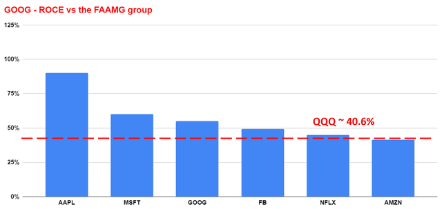 为了展示谷歌的盈利能力,下图将其ROCE(资本使用回报率)与其他FAAMNG股票以及更广泛的科技行业进行了比较。根据计算,谷歌的ROCE在过去3年中平均约为54%。这一ROCE水平与FAAMNG集团(一群表现优异的公司)相比更具优势。对于一般科技行业(大约QQQ),估计平均ROCE约为40%(顺便说一句,SPY的平均ROCE约为20%,作为额外的参考点)。