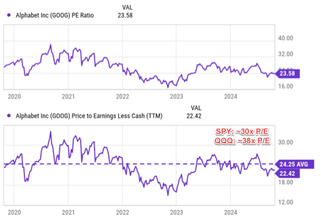 规模性价格调整(尤其是考虑到与更广泛的科技板块的差异)大幅压缩了谷歌的估值,并创造了诱人的入市价。从下图(上图)可以看出谷歌目前的市盈率仅为23.58倍,接近其历史区间的低端。
