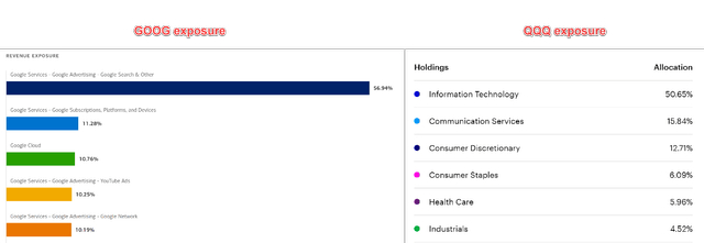 谷歌目前约57%的收入来自搜索和其他业务,突显了其在搜索领域的主导地位。谷歌服务(包括其订阅、平台和设备)贡献了约11%,并且与搜索业务相得益彰。Google Cloud是第三大贡献者(约10%)。在其第二季度报告中,Google Cloud的收入刚刚超过100亿美元,营业利润超过10亿美元,创下了该部门的纪录。鉴于前面提到的对LLM和AI相关应用的强劲需求,这种势头将反映在其第三季度的收益中,并将在未来几年继续保持。相比之下QQQ在增长前景较差的领域(即增长方面)有相当大的敞口(如下图右侧面板所示),例如消费必需品(约6%)、医疗保健(约6%)和工业(约4.5%)。