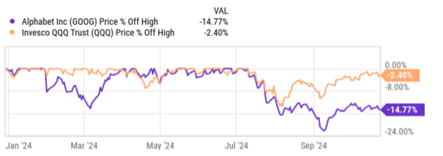 不利的一面是,人工智能领域的竞争日益激烈,谷歌在短期和长期都面临着一些不确定性。短期内,其与Anthropic的合作关系在英国面临一些担忧。长期来看,谷歌的人工智能相关技术和产品(无论是自己的还是合作伙伴的,例如Anthropic的TPU v5e技术)如何与竞争对手的技术竞争还存在不确定性。从最近的抛售来看,负面因素是目前的主导力量。从下图可以看出,以Invesco QQQ Trust(QQQ)ETF为代表的整体科技板块今年迄今基本横盘整理。相比之下,谷歌已从峰值价格水平回调近15%。
