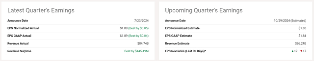 为了更好地说明情况,让我们快速回顾一下谷歌于2024年7月23日发布的第二季度财报。从下图可以看出,结果非常积极,两条线都超出了分析师的预期。标准化每股收益(EPS)为1.89美元,比普遍预期高出0.05美元。此外,该公司的收入达到847.4亿美元,比预期高出4.45亿美元以上。
