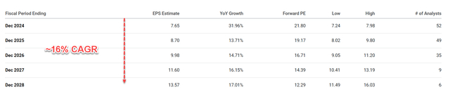 回顾第三季度,下图显示了未来5年谷歌股票的普遍每股收益预测。如图所示,2024财年全年的普遍预期为7.65美元,同比增长31.96%。预计这一积极趋势将持续,2028财年的每股收益预测最终将升至13.57美元。总体而言,分析师的预测表明未来几年的复合年增长率(“CAGR”)约为16%。