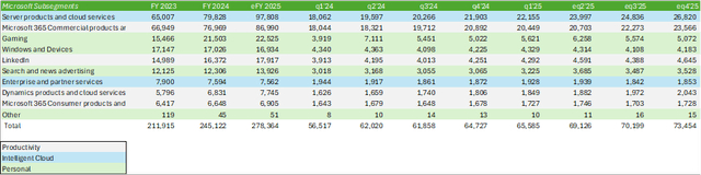 至于运营,预测微软的总收入将达到 690 亿美元,每股摊薄收益为 3.16 美元。预计微软的营业利润率将同比提高近 1%,这得益于智能云部门利润率的提高。展望 2025 财年的剩余时间,预测智能云部门将保持强劲,并在下半年随着更多与人工智能相关的基础设施上线而重新加速增长。
