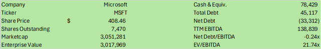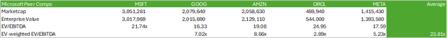 微软股价目前低于其同行超大规模企业的企业价值加权 EV/EBITDA 23.81 倍和 21.74 倍。为了得出这个平均值,每家公司的倍数都根据其各自的企业价值加权,以按规模对平均倍数进行标准化。