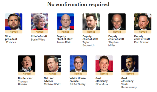 特朗普正在将他寄望于落实自己“美国优先”政策到边境、贸易、经济及其它方方面面的亲信安插到执政团队中。所以特朗普在选人时尤为看重忠诚度,脱颖而出的不乏是在2021年1·6未遂叛乱后及多起刑事审判期间他落魄之时为他辩护的议员和身边人。鉴于他在酝酿一系列预期的行政命令和立法提案来快速实施他的议程并推翻总统乔·拜登的政策,优先获得考虑的还包括那些表示渴望立即采取行动者。