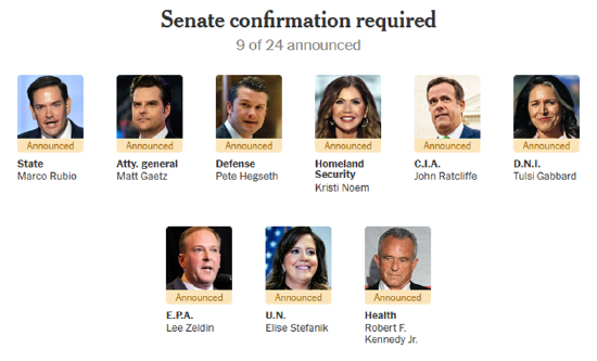美国当选总统特朗普本周继续公布一系列的政府要员提名,其第二任期内阁班底已初具雏形,国务卿、国防部长、总统国家安全事务助理等提名已尘埃落定。但财政部长、商务部长、贸易代表等关键职位人选尚悬而未决。