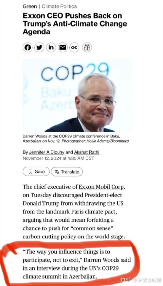 8年前懂王退出巴黎协定,埃克森美孚雪佛龙还敢带头在德州Pasadena和Beaumont建设30万桶/天石油炼化新产能给华尔街上眼药。而如今呢?上周懂王只是刚赢得选举还没入宫呢,昨天埃克森美孚的现任CEO就开始像训孙子一样地训特朗普:“你影响事物的方式应该是加入,而不是退出!”。看到了吧?这都轮不到美国新能源和环保人士发声,如今懂王的金主们对退出巴黎协定开始都直接掀桌子不买账了。