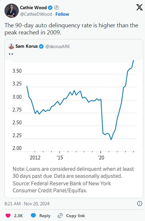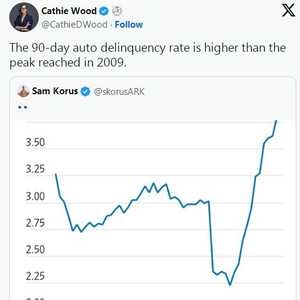 方舟投资管理公司CEO凯茜·伍德对美国的汽车贷款状况发出了警告,她指出,目前90天的拖欠率已经超过了2009年金融危机期间的水平。