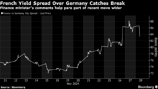 法国10年期国债相对于德国国债的利差 —— 一项市场密切关注的风险指标 —— 周四收窄4个基点,迈向7月份以来的最大跌幅。