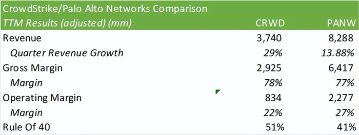 比较两家公司的财务状况,CrowdStrike 的扩张空间明显更大。从利润率的角度来看,Palo Alto 在运营方面表现更佳。根据“规则”,分析师将最近一个季度的调整后营业利润率和收入增长之和作为衡量标准,CrowdStrike 以 51% 的利润率领先于 Palo Alto,而 Palo Alto 为 41%,这主要归功于营收增长。