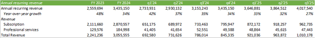 CrowdStrike 的客户群涵盖了财富 100 强企业中的 70% 以上、前 20 家银行中的 18 家,以及 50 个州中的 44 个州的公共客户。截至 2025 年第三季度,CrowdStrike 的 ARR 超过 40 亿美元,同比增长 27%。该公司在 2025 年第三季度完成了 260 笔 100 万美元以上的交易。