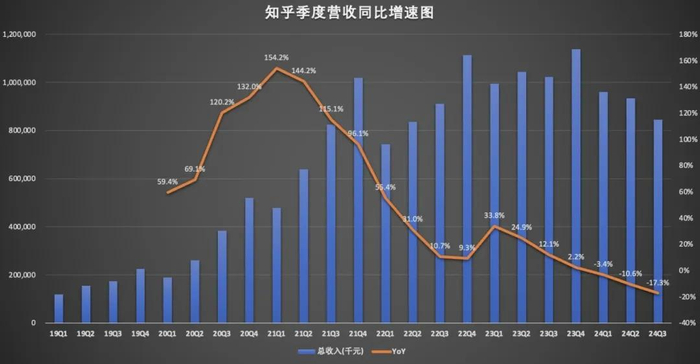 财报显示,三季度知乎平均月活用户数为8110万元,而从整体情况来看,知乎月活用户呈现下滑的趋势,该公司历史上月活用户最高纪录是2023年Q3时候的1.1亿人。