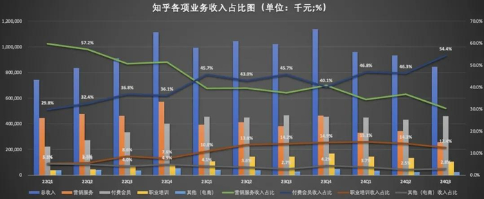 这里需要提醒大家的是,2023年以前,知乎的收入由五部分业务构成,包括广告、付费会员、内容商务解决方案、职业培训、其他。2023年一季度开始,知乎将收入口径做了重新划分,分成营销服务、付费会员、职业培训和其他(电商)。