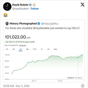 萨尔瓦多总统纳伊布·布克勒(Nayib Bukele)以带领这个国家采纳比特币为法定货币而闻名于世,在比特币突破10万美元后,他在社交媒体上发帖,以一个“笑哭”的表情符号嘲笑那些质疑他做法的人。