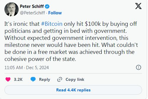 希夫写道:“讽刺的是,比特币通过收买政客和与政府勾结才达到10万美元。如果没有预期的政府干预,这一里程碑永远不会实现。在自由市场中做不到的事情,可以通过国家的凝聚力来实现。”