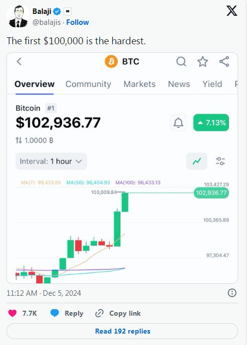 硅谷投资者、著名加密货币倡导者巴拉吉·斯里尼瓦桑(Balaji Srinivasan)表示:“第一个10万美元是最难的。”,暗示比特币未来将会加速上涨。