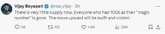 《比特币看涨理由》一书的作者维贾伊·博亚帕蒂(Vijay Boyapati)预测,比特币的下一步走势将是“迅速而猛烈的”。