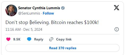怀俄明州共和党参议员辛西娅·卢米斯(Cynthia Lummis)此前提出了一项关于比特币战略储备的法案,她在X上写道:“不要停止信仰。Bitcoin达到10万美元。”