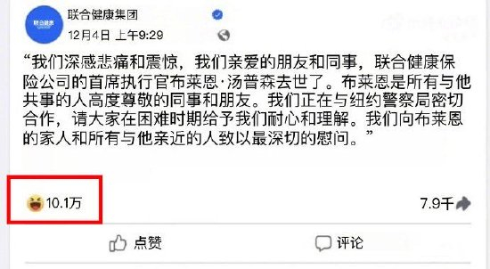 4号,在联合健康集团发布“对挚友和同事去世感到深切悲痛和震惊”的严肃声明下,收到的8万个反应里,有7.5万个是“哈哈”的表情。该公司不得不直接关闭了评论。