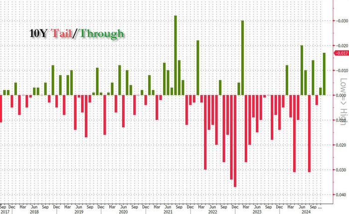 本次拍卖的得标利率为4.235%,低于上次11月5日的4.347%,预发行利率为4.252%,最终得标利率比预发行利率低1.7个基点,为今年6月以来的最大差值,没有出现体现需求疲软的尾部利差。