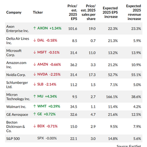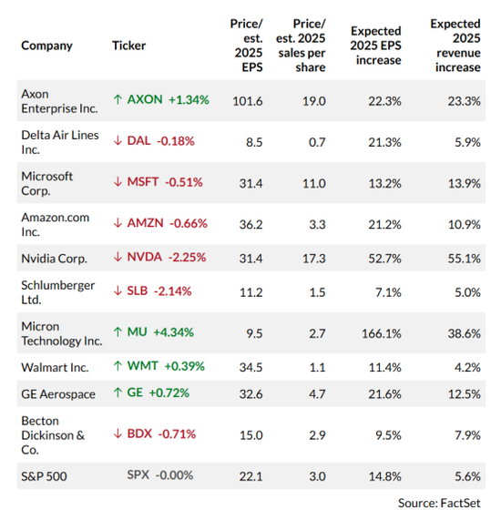 但名单中也包括一些价值型股票,例如达美航空、斯伦贝谢、美光科技和碧迪医疗,它们的市盈率都低于标普500指数的整体水平。从市销率来看,其中有五家公司的估值低于标普500指数,包括沃尔玛。