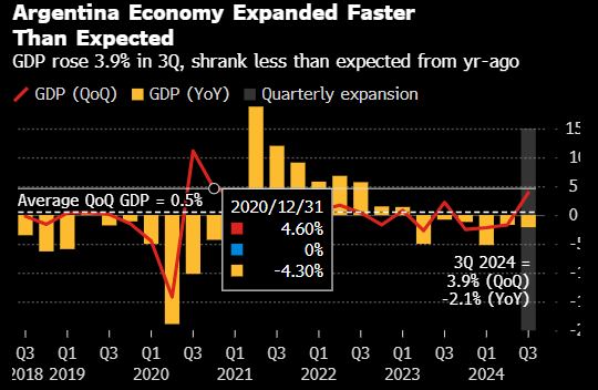 阿根廷在第三季度摆脱了严重的经济衰退,增加了总统哈维尔·米莱在迈向明年中期选举之际实现增长反弹和通胀降温的可能性。