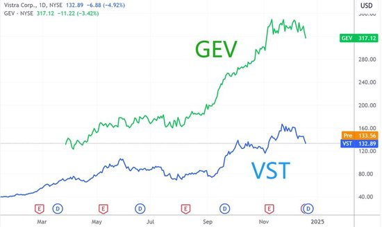 非常有趣的是,排名第二、第三的涨幅亚军和季军(现在应该只能叫有力挑战者),都是来自于能源赛道的企业。其中,美国电力巨头Vistra能源年内上涨247%、从原通用电气拆出来的可持续能源业务GE Vernova累计上涨175%。