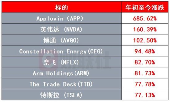 这个赛区的挑战者们,中国投资者就很熟悉了。目前领跑的个股是AI应用龙头Applovin,年内涨幅达到685.62%。即便年底Palantir即将被纳入纳斯达克100指数,但两者之间巨大的涨幅差距,恐怕很难对前者构成威胁。