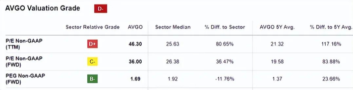 目前,博通的 FWD P/E 非 GAAP 估值为 36.00 倍,尽管较其 1 年平均值 30.57 倍、5 年平均值 19.58 倍、10 年平均值 15.73 倍和行业中位数 26.38 倍有显着上升,但仍具有吸引力。