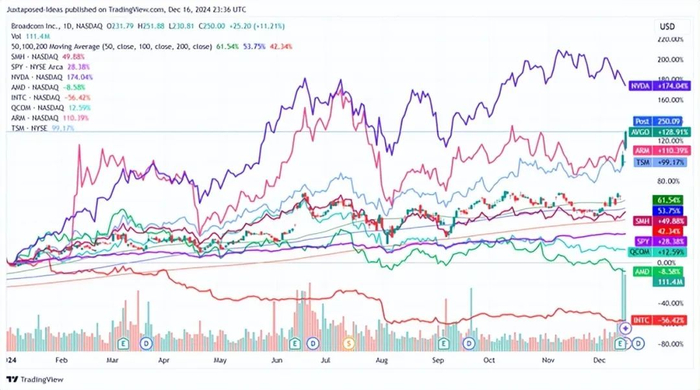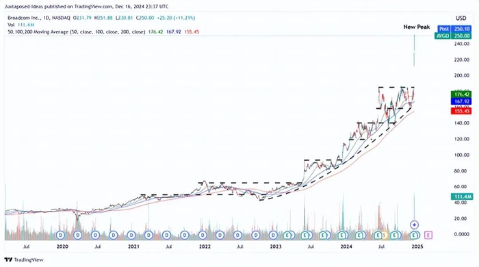 目前,博通的股价已经突破历史水平,达到 250 美元,并远离 50/100/200 天移动平均线。