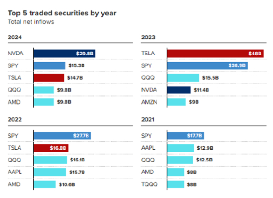 今年排名第二的是SPY ETF,散户投资者总计购买了153亿美元。而特斯拉由去年的第一位降至第三位,购买量从480亿美元骤降至147亿美元。Invesco QQ Q Trust ETF和AMD各录得98亿美元,分别排名第四和第五位。