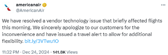 美国航空在X上发帖表示,影响周二上午航班安排的供应商技术问题已得到解决。