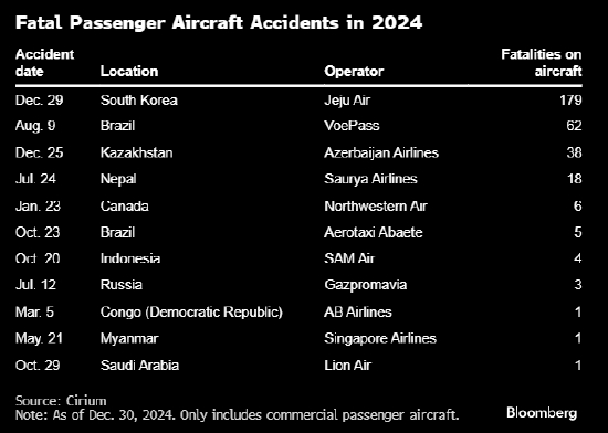 上周阿塞拜疆航空一架飞机坠毁后,韩国济州航空客机发生严重空难,商业航空业遭遇了2018年以来致死人数最多的一年。