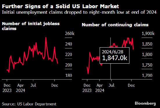 美国2024年末首次申领失业金人数创八个月低点,显示裁员数相对温和,劳动力市场意外保持坚韧。