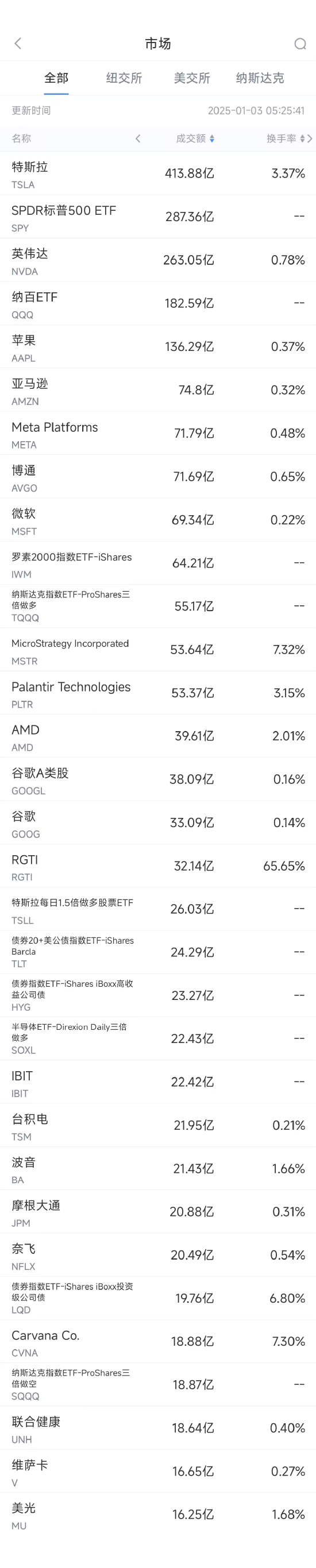 1月2日美股成交额前20:特斯拉大跌6%,全年交付量10多年来首次下滑