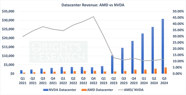 最新和即将发布的产品也正在获得热度,因为管理层表示,客户对 10 月份推出的 MI325X 非常感兴趣,目前正在扩大规模。虽然我们看到 MI325X 在与英伟达Hopper 平台(例如 H200)的竞争中表现出色,但我们认为它们仍然落后一代,因为与目前正在扩大规模的英伟达Blackwell 的竞争可能不那么顺利。