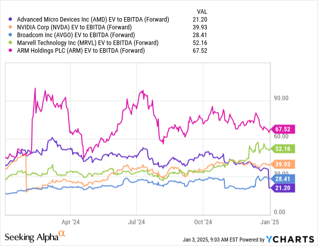按预期 EV/EBITDA 计算,AMD 不仅是与直接竞争对手相比最便宜的公司之一(仅为英伟达的 39.93 倍,即 21.20 倍),而且博通、Marvell 和 Arm等其他半导体公司相比也很便宜,后者的市盈率通常为 30 倍或更高。