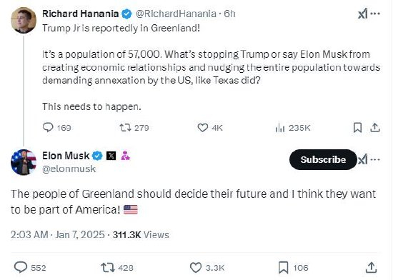 特朗普的亲密顾问埃隆·马斯克(Elon Musk)周一也加入了这场对话,他在X上发帖说,“格陵兰人民应该决定自己的未来,我认为他们希望成为美国的一部分!”