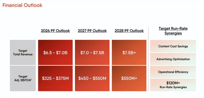 如上图所示,从债务角度来看,这笔交易将真正改变 fuboTV。目前,该公司的净债务为 1.71 亿美元。但交易完成后,如果基本面从现在到那时没有变化,该公司的净现金状况应该为 4900 万美元。再加上上述交易带来的规模,应该会为业务创造一些有意义的协同效应。合并后的公司 2026 年的收入将在 65 亿至 70 亿美元之间,管理层应该能够产生 3.25 亿至 3.75 亿美元的 EBITDA。但预计年运行率协同效应将达到 1.2 亿美元或更多,到 2028 年,这一数字应该会攀升至 5.5 亿美元或更多,收入将超过 75 亿美元。