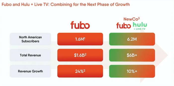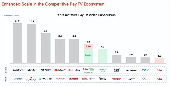 对两家公司股东来说,另一个利好因素是这将创造额外的规模。根据与此次交易公告相关的投资者介绍,fuboTV 拥有约 160 万北美用户。相比之下,Hulu + Live TV 拥有约 460 万用户。这将使 fuboTV 的年收入从约 16 亿美元上升至约 60 亿美元。这使它能够超越其他付费电视公司,如 Cox、Optimum 和 Fios。它将与谷歌拥有的 80 亿美元 YouTube TV 相差无几。