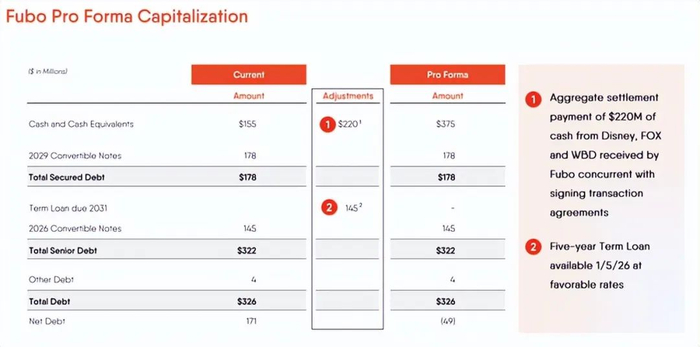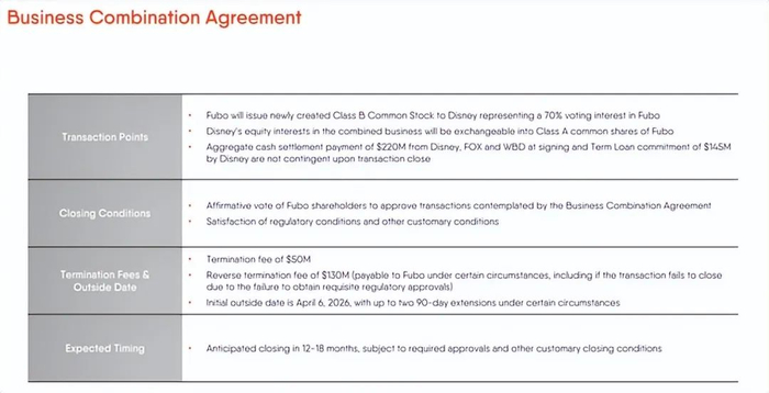 说到交易完成,这里有一些规定。如果 fuboTV 最终退出合并,它将不得不向迪士尼支付 5000 万美元的终止费。另一方面,在大多数其他情况下,例如无法获得监管部门批准,迪士尼将不得不向这家小型流媒体平台支付 1.3 亿美元。与此次合并无关,而是与 Venu 的和解有关,迪士尼及其合作伙伴已同意向 fuboTV 支付 2.2 亿美元,无论交易是否完成。如果交易确实完成,那么迪士尼将在 2026 年向 fuboTV 提供 1.45 亿美元的运营贷款。