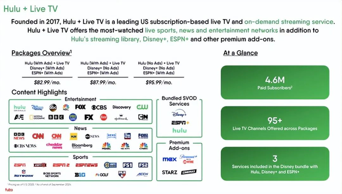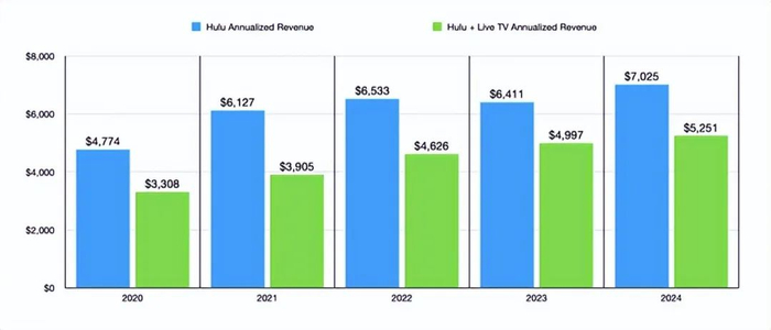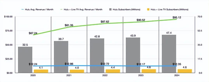 具体到迪士尼,如果主要目标是能够继续推进 Venu,那么这笔交易是有意义的。然而,目前尚不清楚该公司是否仅基于 Hulu + Live TV 的基本面做出了正确的决定。要明确一点,这笔交易并不包括 Hulu 的全部。它只包括涉及直播电视的部分。Hulu 独立拥有约 4740 万付费用户,到 2024 年,他们平均每月向该公司支付约 12.35 美元。这相当于年收入约 70.2 亿美元。除此之外,Hulu + Live TV 拥有 460 万付费用户,平均每月支付 95.12 美元。这相当于年收入约 52.5 亿美元。