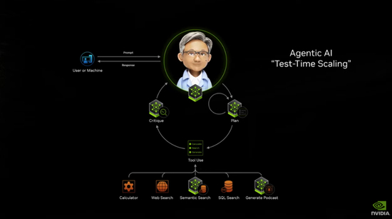 黄仁勋推出具有“Teat-Time Scaling”功能的Agentic AI,支持计算器、网络搜索、语义搜索、SQL搜索等工具,甚至可以生成播客。