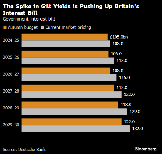 不过,Weale表示,当前这些事件让人想起1976年的债务危机“噩梦”,当时迫使政府向国际货币基金组织寻求救助。当前的债务成本飙升,也可能让财政大臣Rachel Reeves在预算规则方面99亿英镑(122亿美元)的微薄缓冲资金化为乌有,并在3月26日官方财政更新之前造成不稳定。