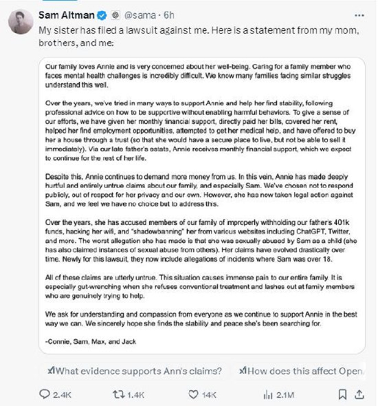 当地时间周二,39岁的萨姆·奥特曼代表他自己、他的母亲和兄弟们在X上发表了一份声明,称这些说法“完全不真实”。