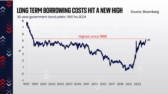 周四,由于投资者担心英国政府借款规模不断增加以及整体经济低迷,英国长期国债收益率进一步升至1998年以来的最高水平,而英镑兑美元汇率则连续第三日大幅下跌。