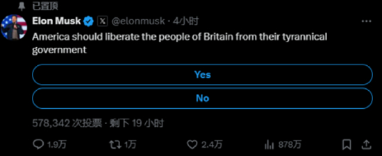 当地时间周一,马斯克在社交媒体X上发起一项关于“美国是否应该解放英国人民”的民意调查。